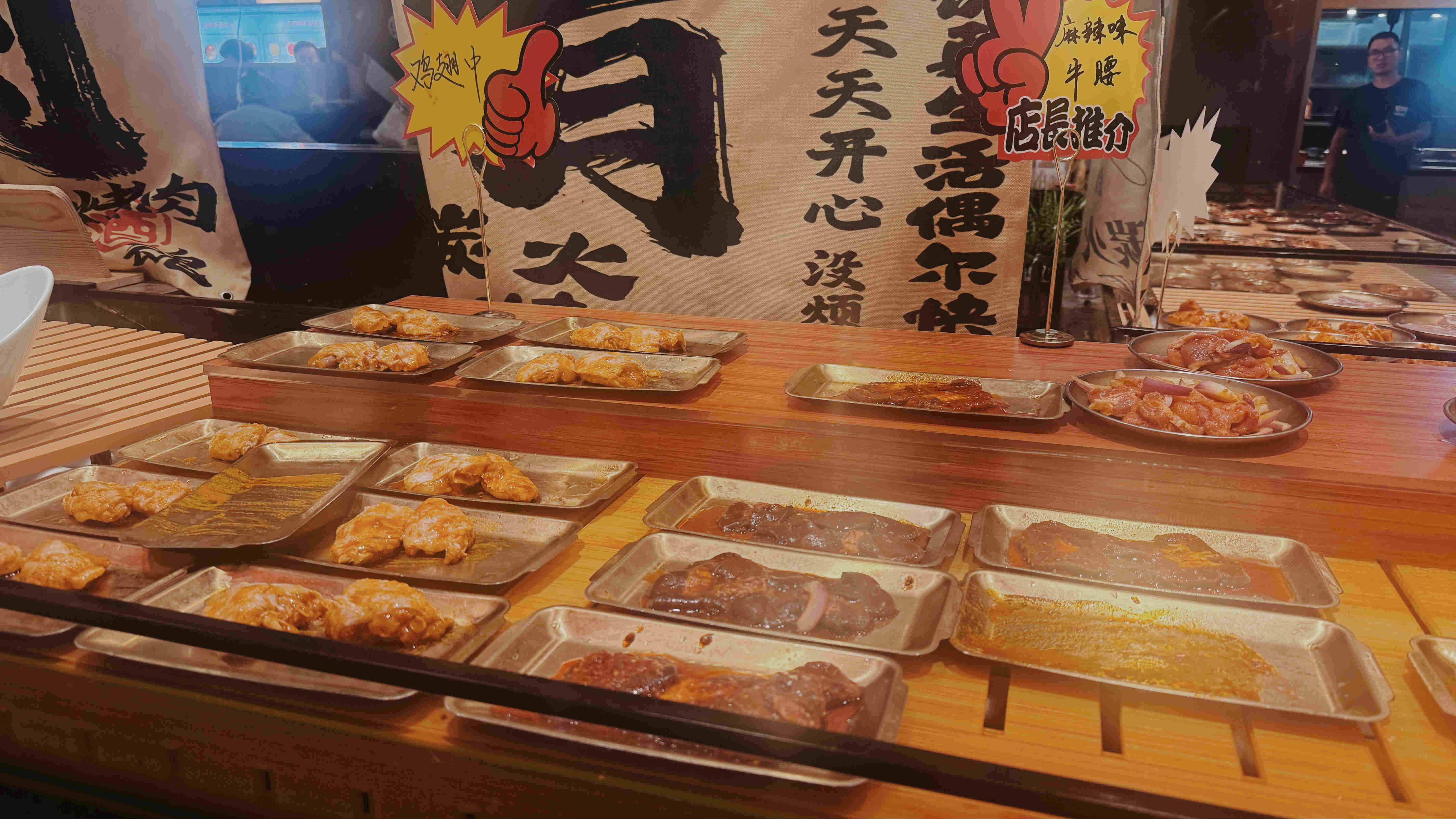 烤肉區(qū)的五花肉在鐵板上滋滋冒油,香氣四溢;牛肉片紋理分明,烤至七分熟時(shí)口感最佳。而火鍋區(qū)則是紅油翻滾,毛肚、黃喉、肥牛在麻辣湯底中起起落落,讓人食指大動(dòng)。